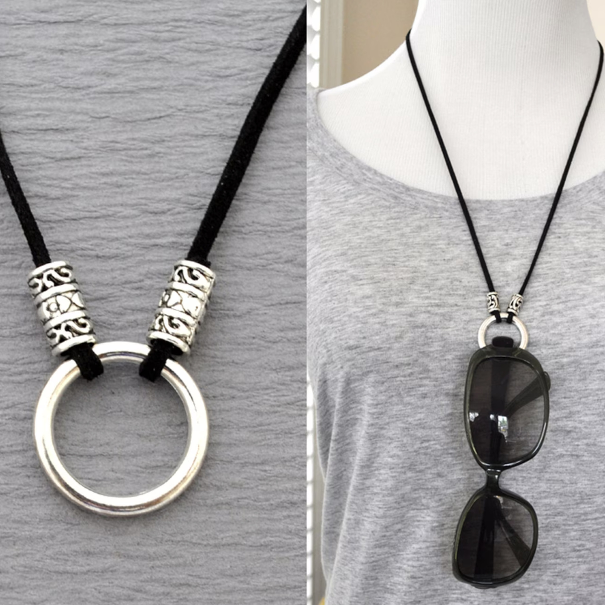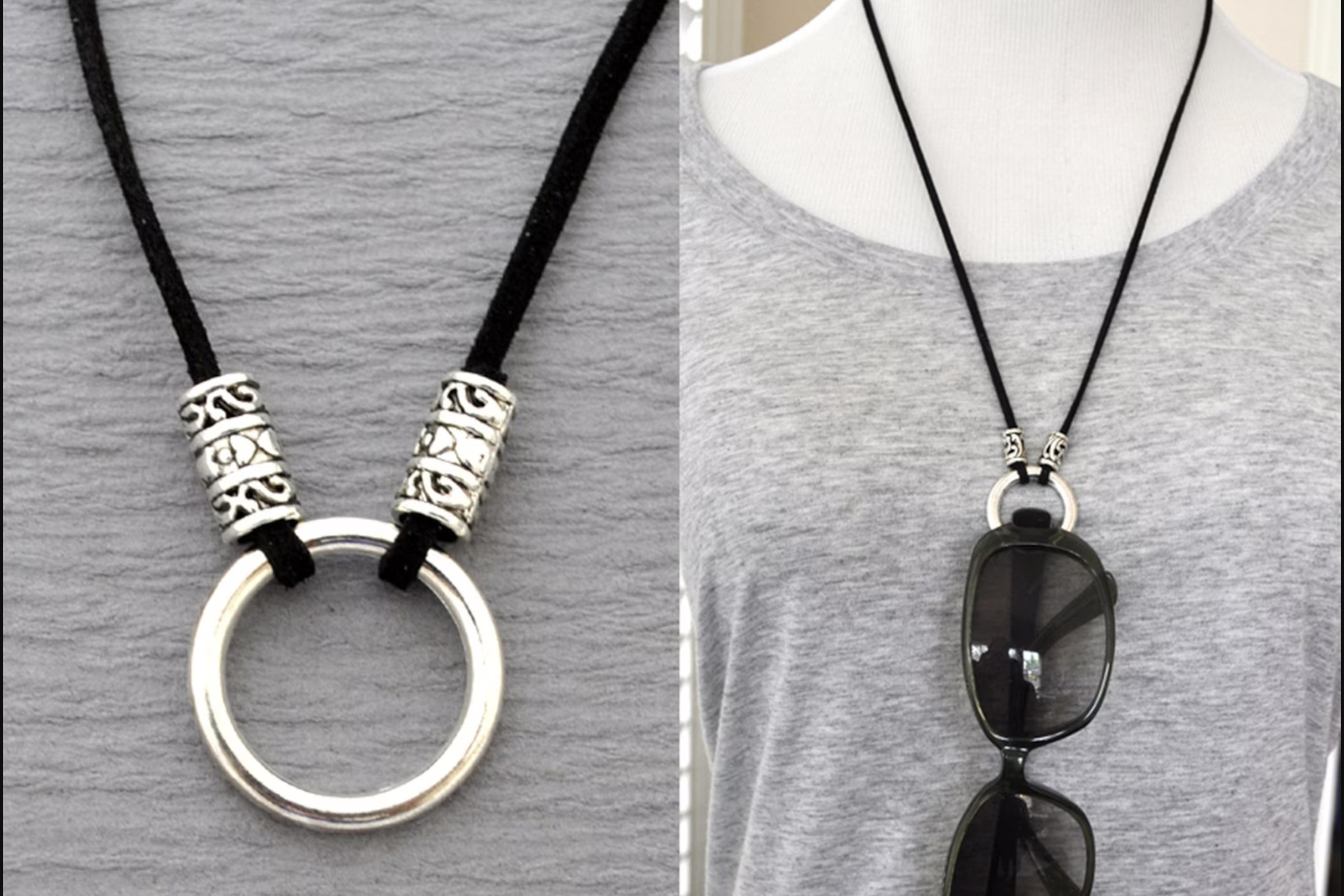 A necklace made from faux suede cord with a silver or bronze ring to keep your eyeglasses handy.
